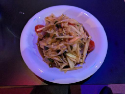 乾杯 20時~ /定休日:月曜日 2026年3月営業開始。内装工事でレイアウトやデザインを変更しています。トイレも新調したのでピカピカの清潔感のあるお店に仕上がっています。じゅんこママは「ウボン」出身。ウボンは、東はラオス、南はカンボジアに接するムーン川に沿ったタイ最東部の都市。お勧め観光地は「セーンチャン滝」。岩肌を流れる川が、長い年月をかけて自然的に掘られた穴の中に吸い込まれて滝になっているそうです。陽気で明るいじゅん子ママがお店を大いに盛り上げてくれます。飲んでいてい楽しいお店です。 タイ東北部の郷土料理ソムタムスライスした青パパイヤと調味料を叩き和えたサラダ。辛味、塩味、酸味、甘味を同時に味わえ、青パパイヤのシャキシャキとした食感も楽しめます。 戻る